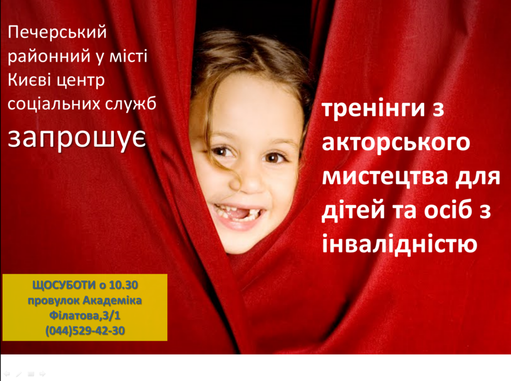 Щосуботи, в будь-яку пору року, фахівці Печерського районного у місті Києві центру соціальних служб за сприяння громадської організації «ТЕАТРАЛІУМ – ЮА» разом з тренером Бєловю Євгенією Владиславівною проводять заняття з акторській майстерності для дітей з інвалідністю і не тільки.
