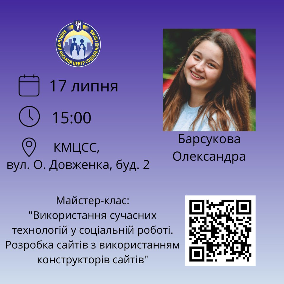 17 липня о 15.00 на базі Київського міського центру соціальних служб відбудеться майстер-клас методиста КМЦСС Барсукової Олександри. Вона буде виборювати звання Майстра із соціальної роботи та представляти власний досвід щодо можливостей використання сучасних технологій у соціальній сфері. На прикладі створення сайтів на базі конструкторів вона покаже можливості здійснення інформування територіальної громади.
