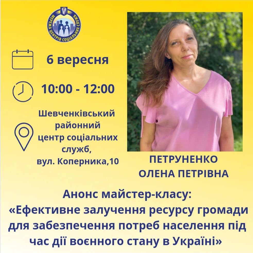 6 вересня о 10.00 на базі Шевченківського районного в місті Києві центру соціальних служб (вул. Коперніка, 10) відбудеться майстер-клас соціального менеджера «Служби соціального супроводження», кандидата у Майстри соціальної роботи Петруненко Олени.