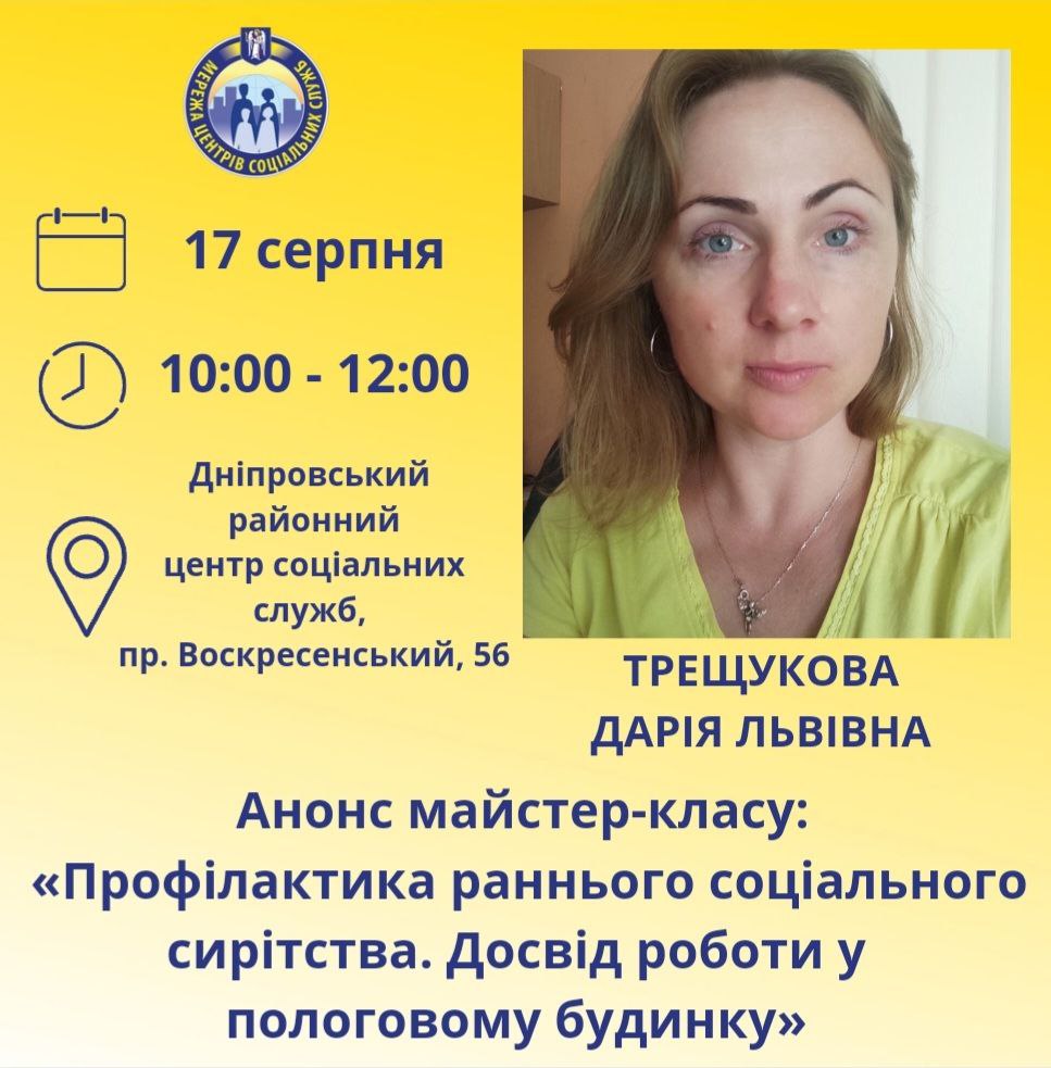 17 серпня о 10.00 на базі Дніпровського районного в місті Києві центру соціальних служб (пр. Воскресенський, 56) відбудеться майстер-клас керівника «Служби соціального супроводження» Дніпровського РЦСС, кандидата у Майстри соціальної роботи Трещукової Дарії.