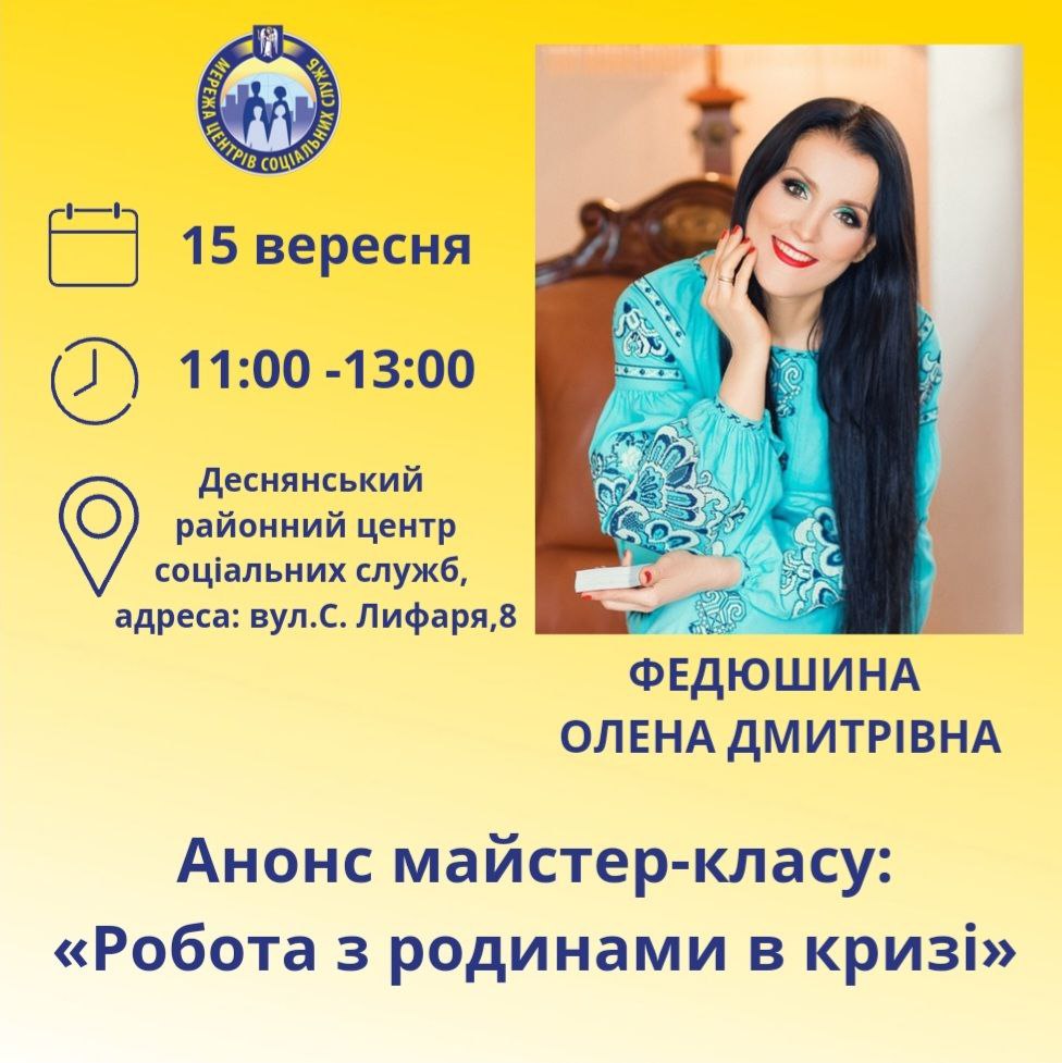 15 вересня з 11.00 до 13.00 на базі Деснянського районного у м. Києві центру соціальних служб (вул. С. Лифаря, 8) практичний психолог Центру, сімейний терапевт, тренер груп для жінок, підлітків та дітей, яка працює з опікунськими родинами, родинами військових та тими, хто має співзалежні стосунків у родині, Олена Федюшина проведене свій майстер-клас на тему: «Робота з родиною в кризі”.