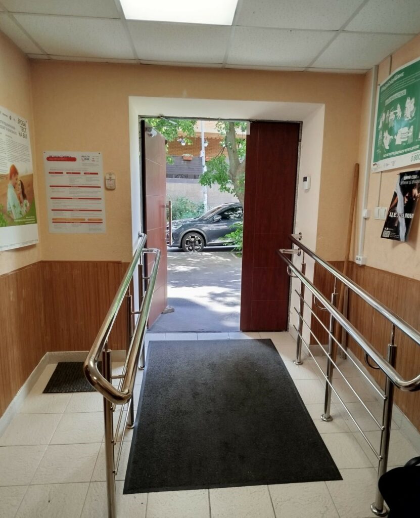 - Пандус з поручнями для зручного доступу людей з інвалідністю та батьків з дитячими візками.