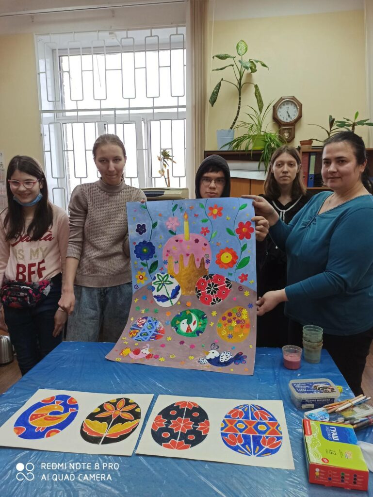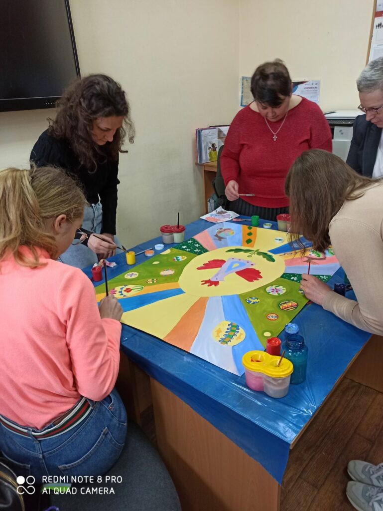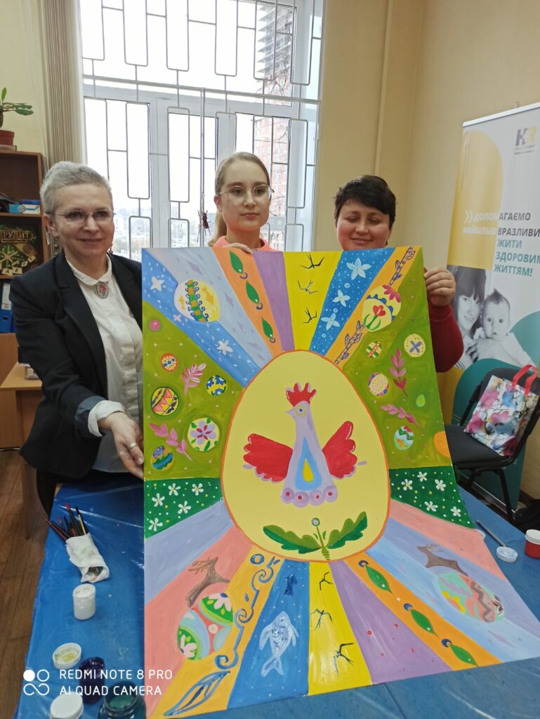 Діти дуже раділи процесу малювання та спілкуванню. Результатом майстер класу стали дві великі спільні картини до Великодня.