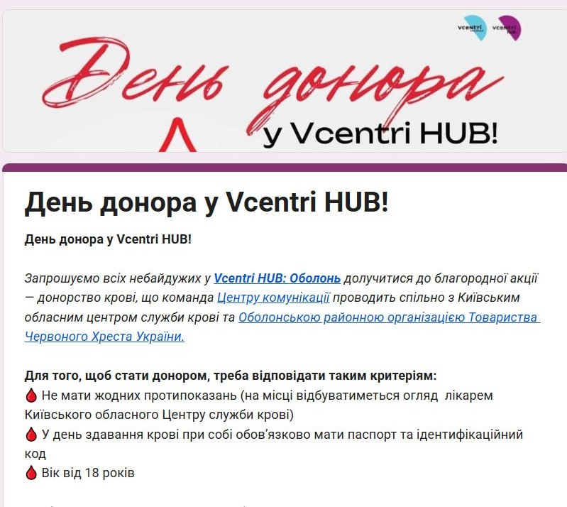 За ініціативи КНП «Центр комунікації» спільно з КНП «Київський обласний центр служби крові» та Оболонською районною організацією Товариства Червоного Хреста України відбудеться День донора.