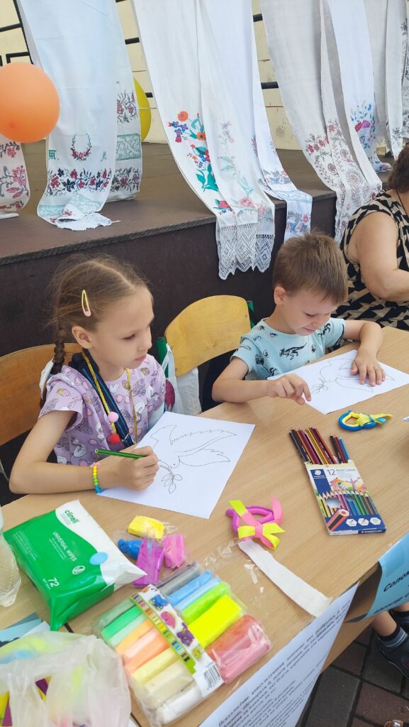 У затишному Парк “Відрадний” розташувалися столи, за якими наші фахівці навчали дітлахів виготовляти ляльок-мотанок, жовто-блакітні квіти з серветок, соняшники.