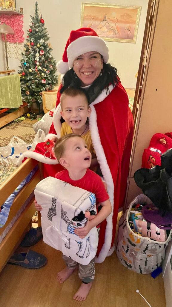На фото представник БФ “Здоровий Всесвіт”, Місіс Санта обіймає дітей даруючи їм тепло свого серця