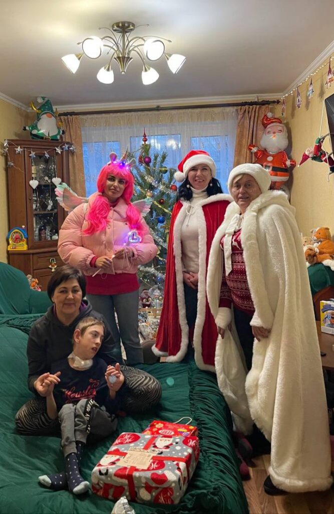 На фото представники БФ “Здоровий Всесвіт” та Центру в святкових образах разом з родиною під час вручення подарунків