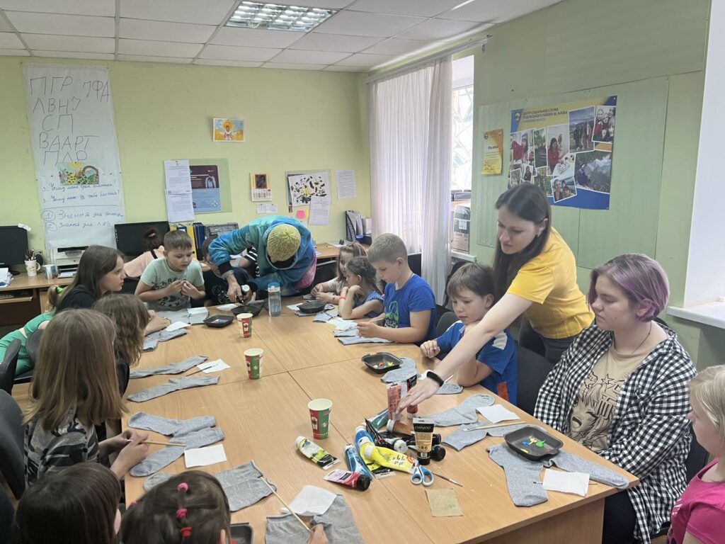 Для психологічної підтримки сімей мешканців Подільського району в приміщенні Центру соціальних служб провели майстер-клас. Учасники мали можливість розмальовувати акриловими фарбами різноманітні національні малюнки на шкарпетках. Дане заняття сприяє позитивному емоційному стану та психологічному розвантаженню. Наприкінці заходу даним сім’ям видали продуктові набори.