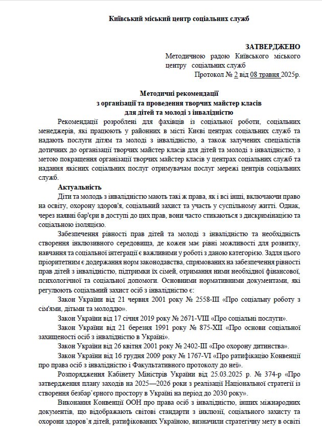 - Рекомендації для фахівців із соціальної роботи відповідальних за організацію творчих майстер класів та ін.