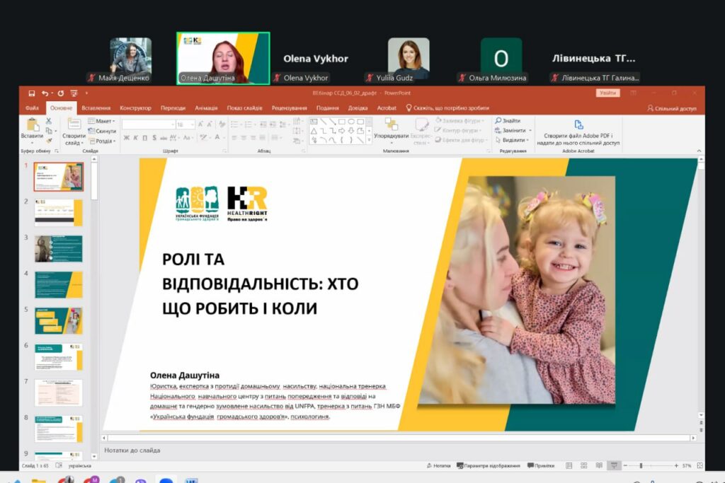 Експертну частину вебінару провела Олена Дашутіна — психологиня, національна тренерка Національного навчального центру з питань попередження та відповіді на домашнє та гендерно зумовлене насильство від UNFPA, тренерка з питань ГЗН МБФ «Українська фундація громадського здоров’я».