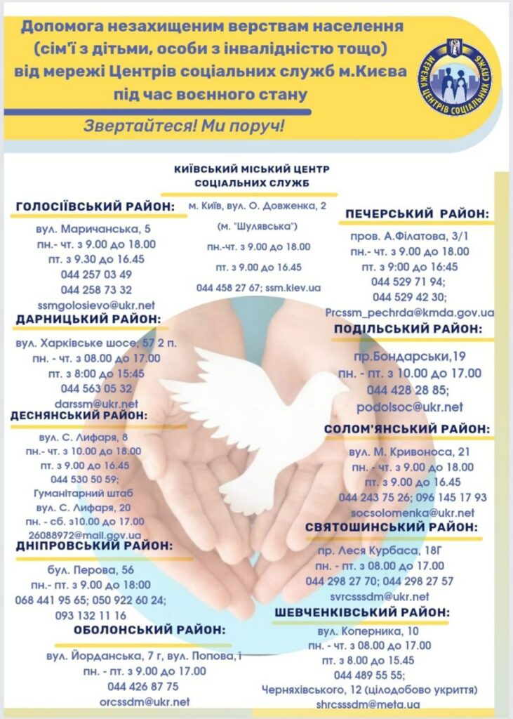 Шановні мешканці міста Києва – кияни і члени родин, які мають статус внутрішньо-переміщеної особи з реєстрацією у місті Києві! Інформуємо вас про те, що в Україні і, зокрема, у місті Києві, триває процес збору інформації про потреби населення в соціальних послугах. Більш детально про це можна дізнатись ознайомившись з інформацією на сайті Київського міського центру соціальних служб – https://kmcss.kyiv.ua/