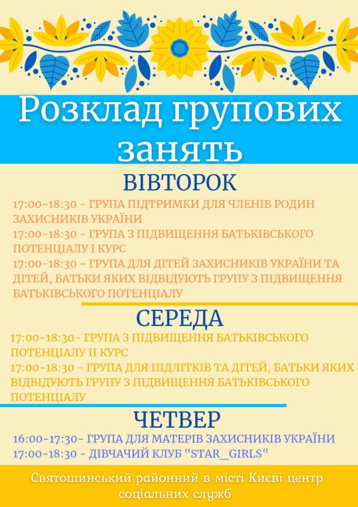 Головна > Новини > Розклад роботи груп Святошинського районного в місті Києві центру соціальних служб