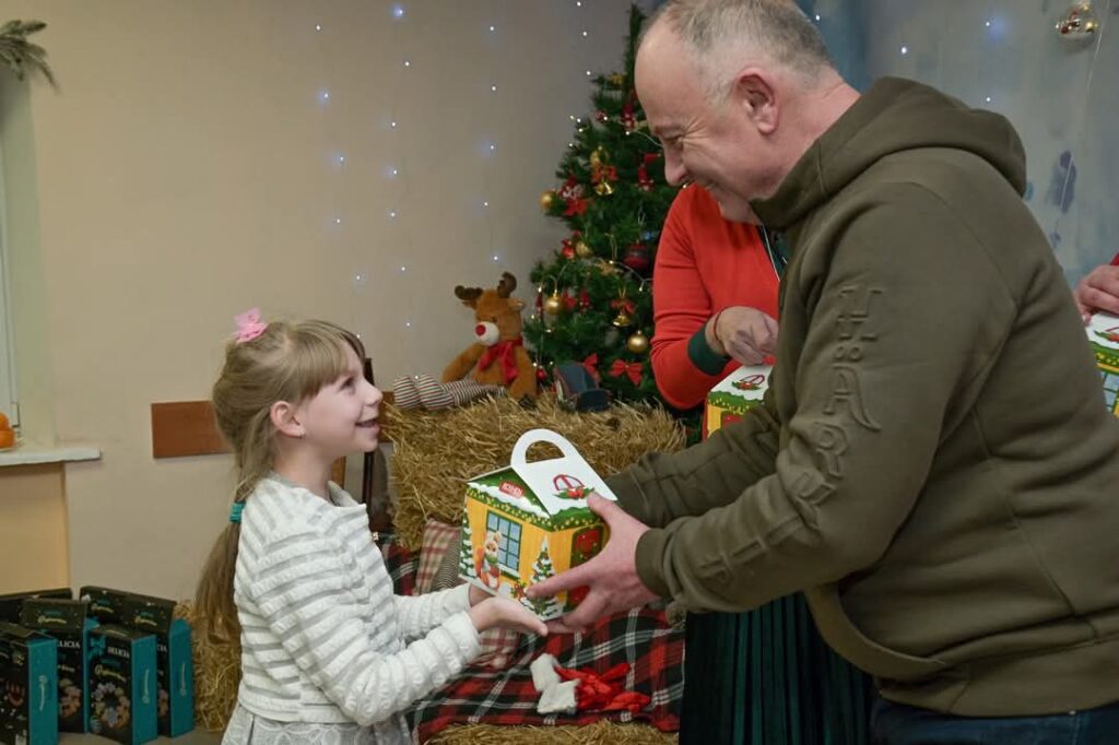 На фото голова Святошинської районної державної адміністрації вручає дитині солодкий подарунок