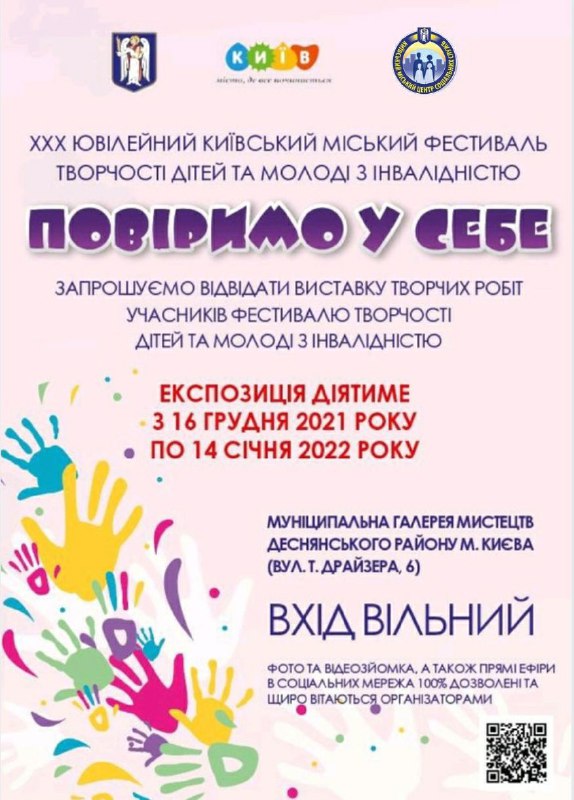 Різдвяний благодійний ярмарок творчих робіт «Мрії здійснюються» учасників 30-го ювілейного Київського міського фестивалю творчості дітей та молоді з інвалідністю «Повіримо у себе». Запрошуємо відвідати виставку-ярмарок, який діятиме з 16 грудня 2021 року по 14 січня 2022 року у Муніципальній галереї мистецтв Деснянського району м. Києва (вул. Т. Драйзера, 6).