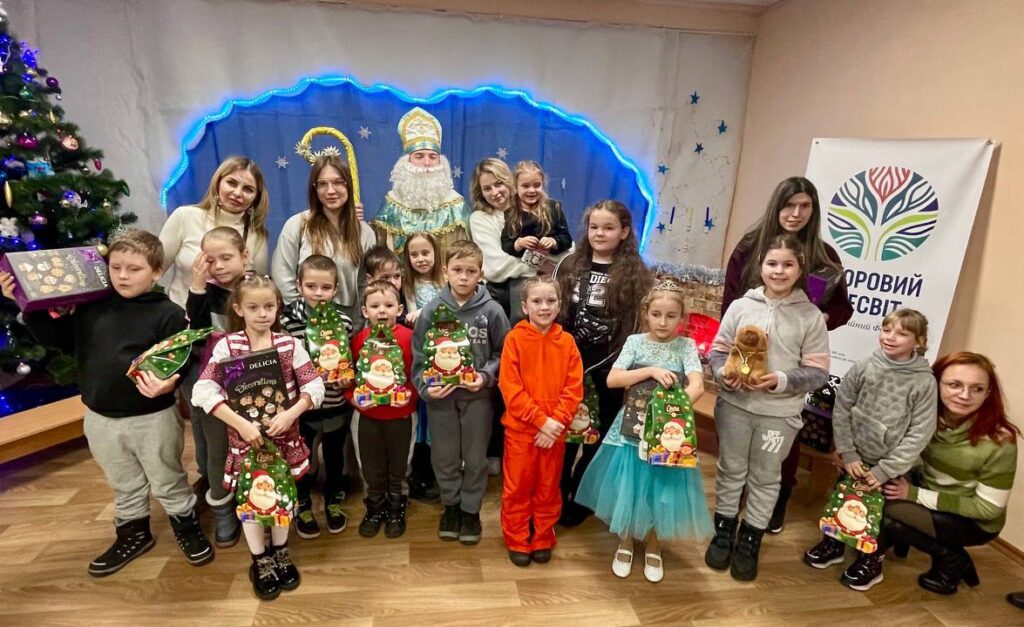 На фото діти в Централізованій системі підліткових клубів “Щасливе дитинство” з подарунками та представниками БФ “Здоровий Всесвіт”