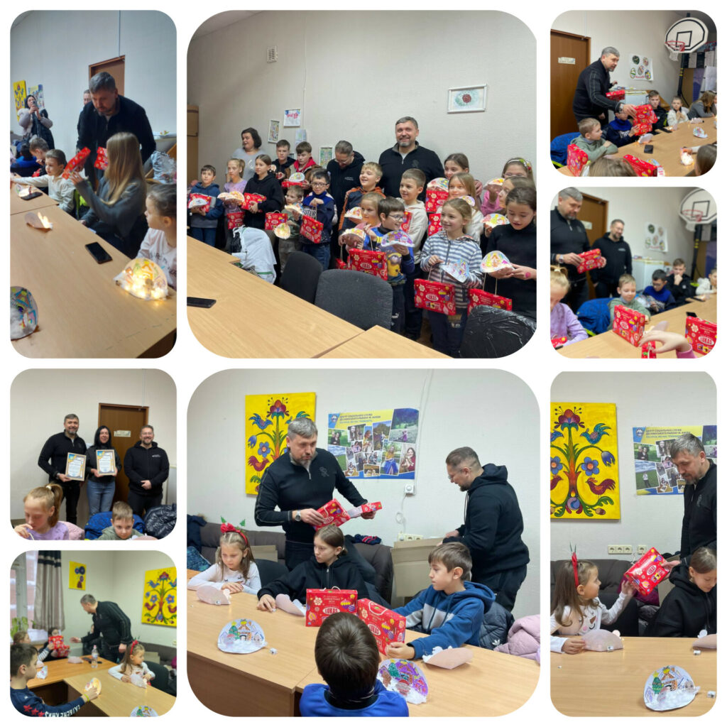 На фото діткам отримують солодкі подарунки від помічника Святого Миколая