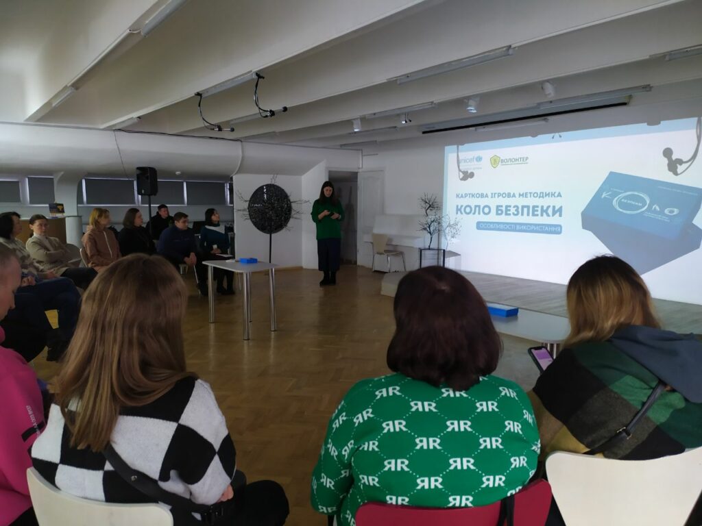 В рамках Всеукраїнської кампанії «16 днів проти насильства» 27 листопада Київський міський центр соціальних служб організував навчальну зустріч для працівників мережі Центрів соціальних служб м. Києва, які працюють за напрямом попередження насильства. Фахівці знайомилися ближче та опановували корисний дієвий, практичний та цікавий робочий інструмент щодо запобігання та протидії насильству – карткову ігрову методику «Коло безпеки», підготовлену ВГЦ «Волонтер». З презентацією гри перед спеціалістами виступила керівниця відділу комунікацій, тренерка ВГЦ Волонтер, одна з авторок методики Вікторія Янковець.