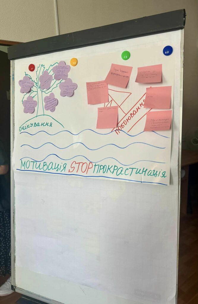 Ця тема є дуже актуальною для багатьох із нас. Під час тренінгу підлітки розглянули відмінність між «Прокрастинація» та «Лінь». Обговорили особливості різних видів прокрастинації та використовували метафоричні картки для аналізу власного стану.