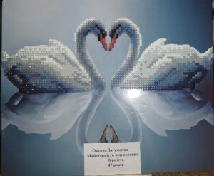 На фото робота Оксани Загуменної “Вірність”, на якій зображена пара лебедів у техніці алмазної вишивки