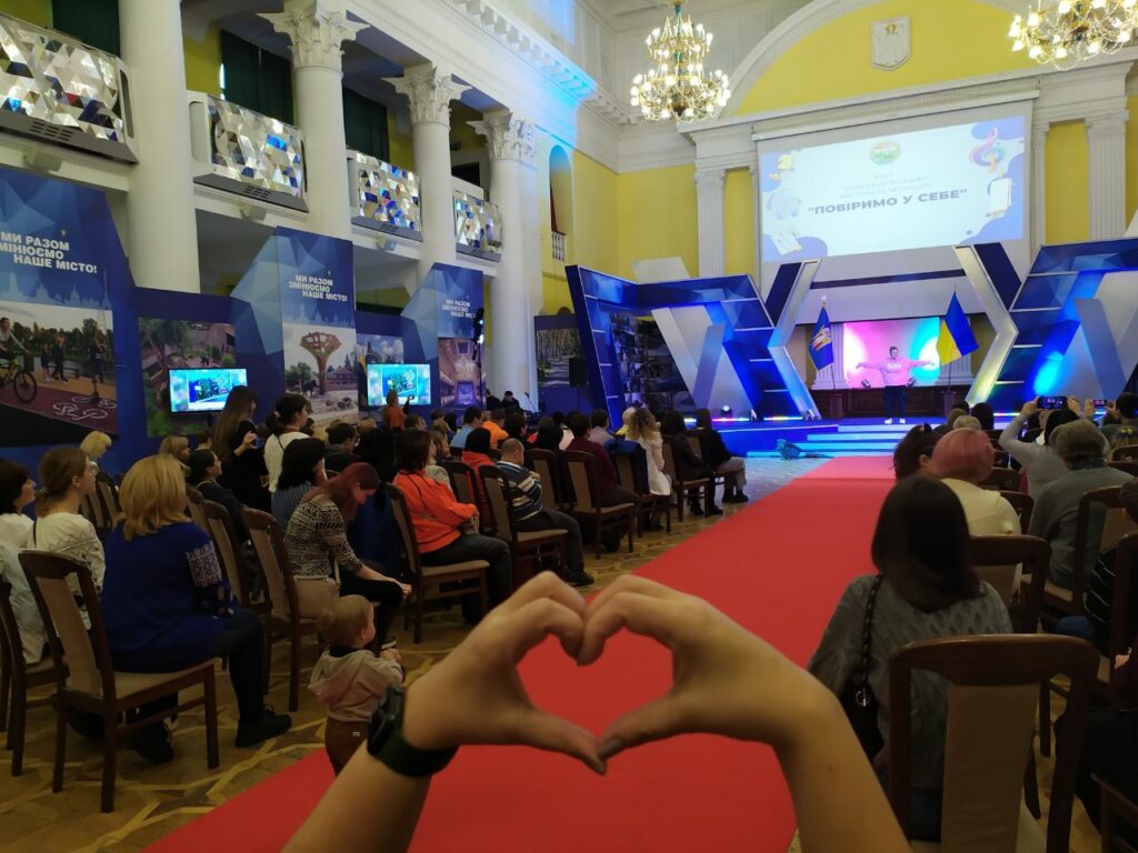 На фото у приміщенні мерії сцена та учасники зустрічі на стільцях, руки показують серце
