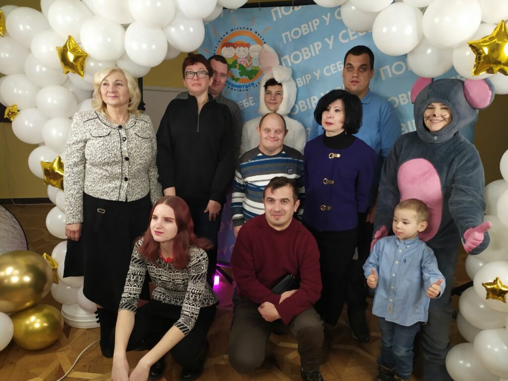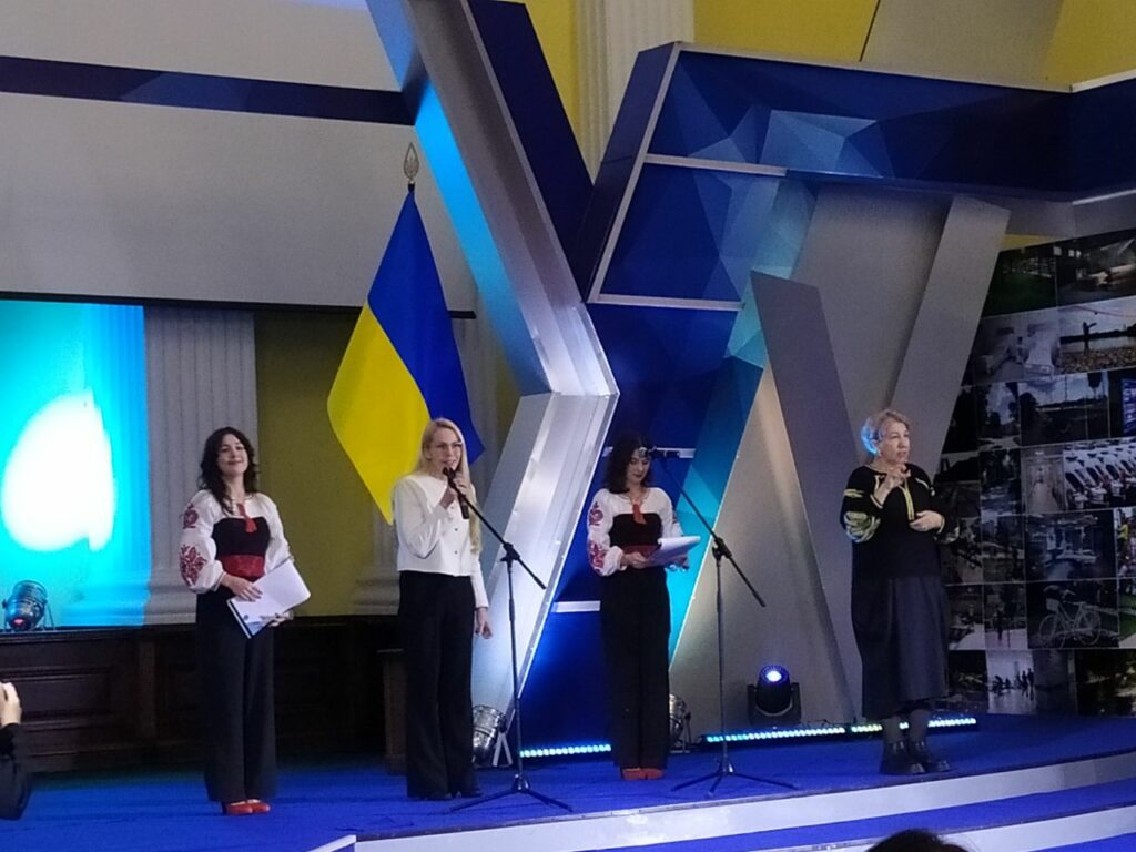 На фото Галина Довганчин вітає учасників зустрічі, поруч ведучі- сестри Наруцькі, перекладач жестовою мовою Марина Ліферова