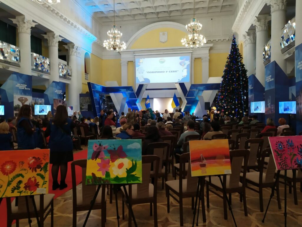 На фото святкова колонна зала КМДА з учасниками, на першому плані образотворчі роботи учасників