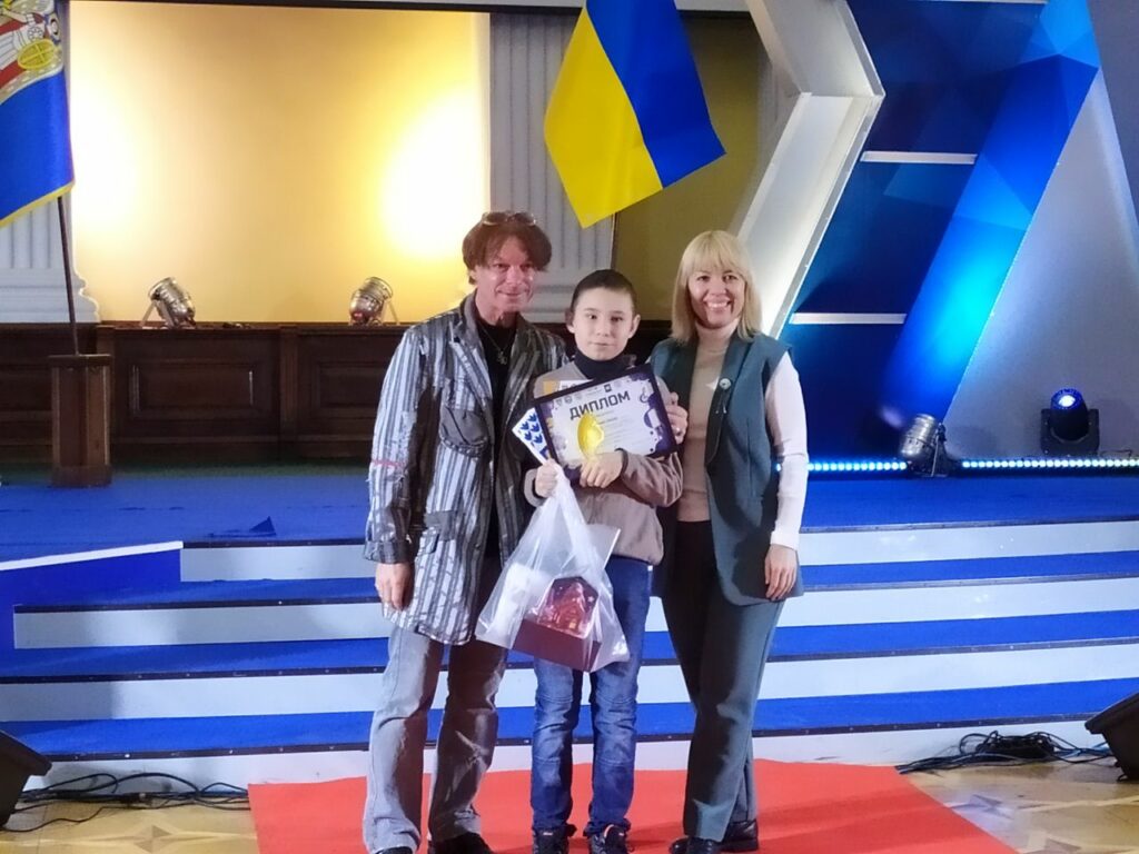 На фото на фоні сцени 2 члени журі вручають Назару кубок, свідоцтва та подарунок