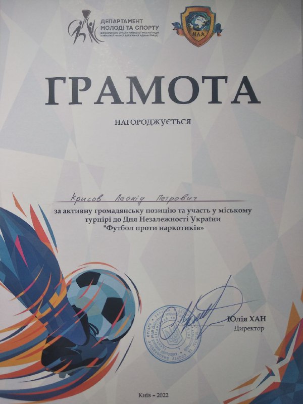 Нещодавно у столиці відбувся турнір з міні-футболу під гаслом «Футбол проти наркотиків» присвячений Дню Незалежності України. Захід проходив в рамках проекту «Громадського бюджету м. Києва», який реалізовувався «Міжнародною антинаркотичною асоціацією» за підтримки Департаменту молоді та спорту КМДА.