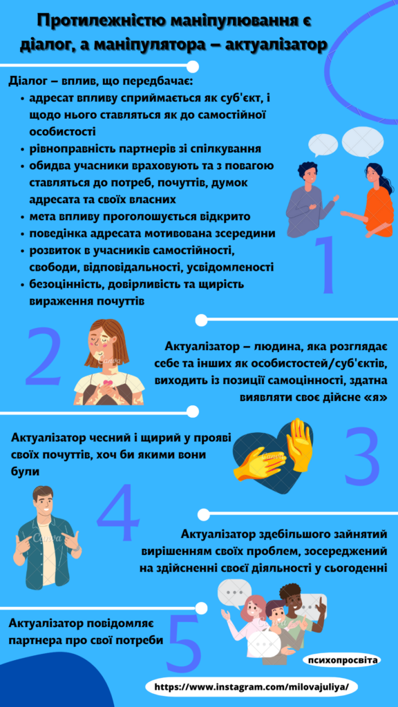 Соціальна служба спрямована на розвиток самостійності та відповідальності одержувачів послуг. Це вимагає побудови чесних взаємин фахівців із клієнтами. Але буває, що в їх взаєминах трапляються спроби маніпулювати, що може призвести до втрати довіри та можливостей для особистісного розвитку обох сторін. Тому важливо вивчити, чим насправді є маніпулювання, й чому діалог і актуалізація корисніше