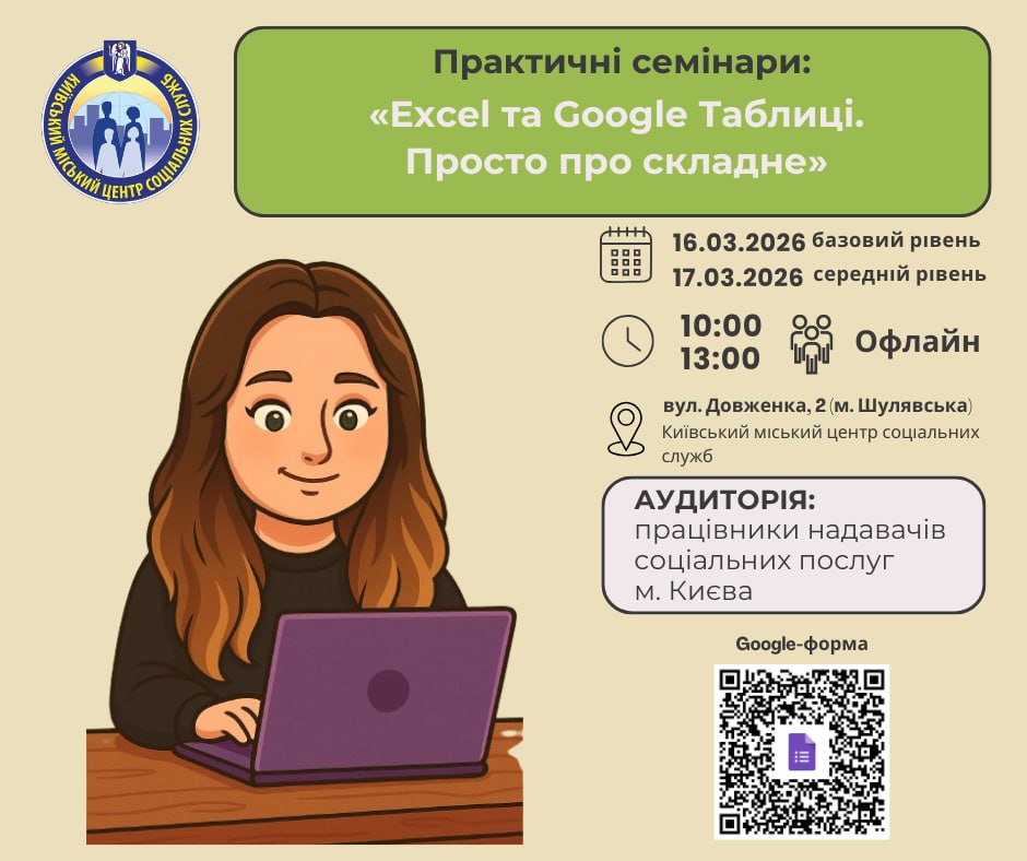 Дякуємо за вашу активність та зацікавленість у навчанні! Набір на навчання: «Excel та Google Таблиці. Просто про складне» (базовий рівень), які відбудуться 16 та 17 березня 2026 року (10:00–13:00) у Київському міському центрі соціальних служб (вул. О. Довженка, 2) — вже завершено.