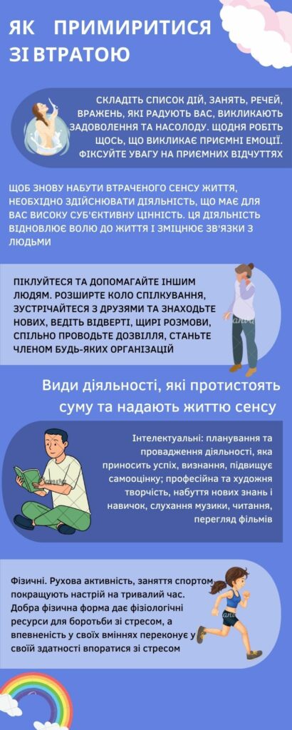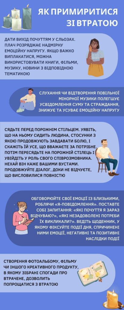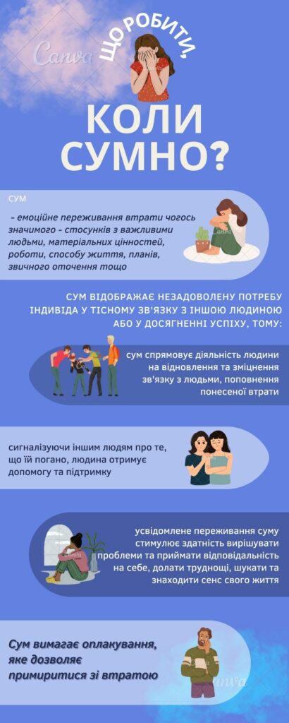 Що робити, коли сумно? Мілова Юлія Володимирівна 17.08.202217.08.2022 Новини, Солом'янський район, Солом'янський район Війна – час втрат і поневірянь. Тому важливо вміти приймати та справлятися з емоціями смутку, суму, горя. Інфографіка розповість, як це можна робити