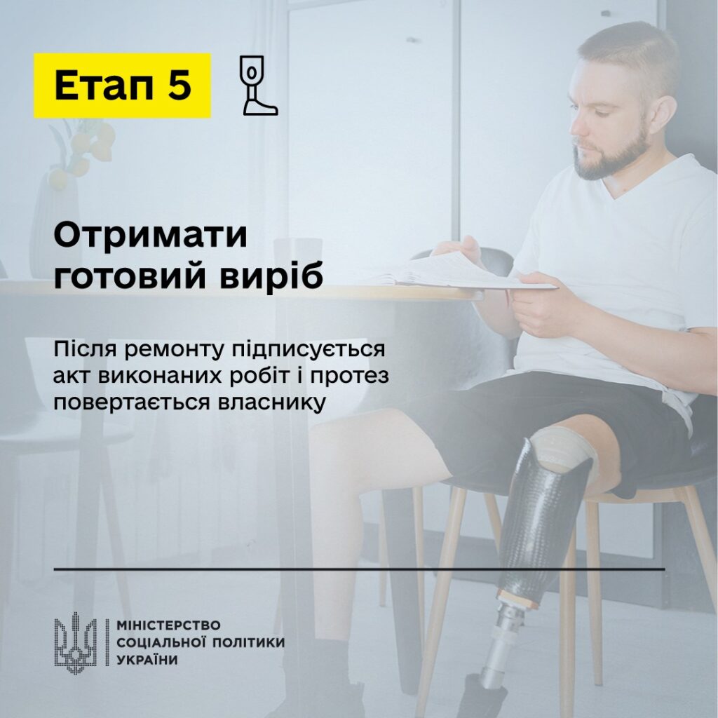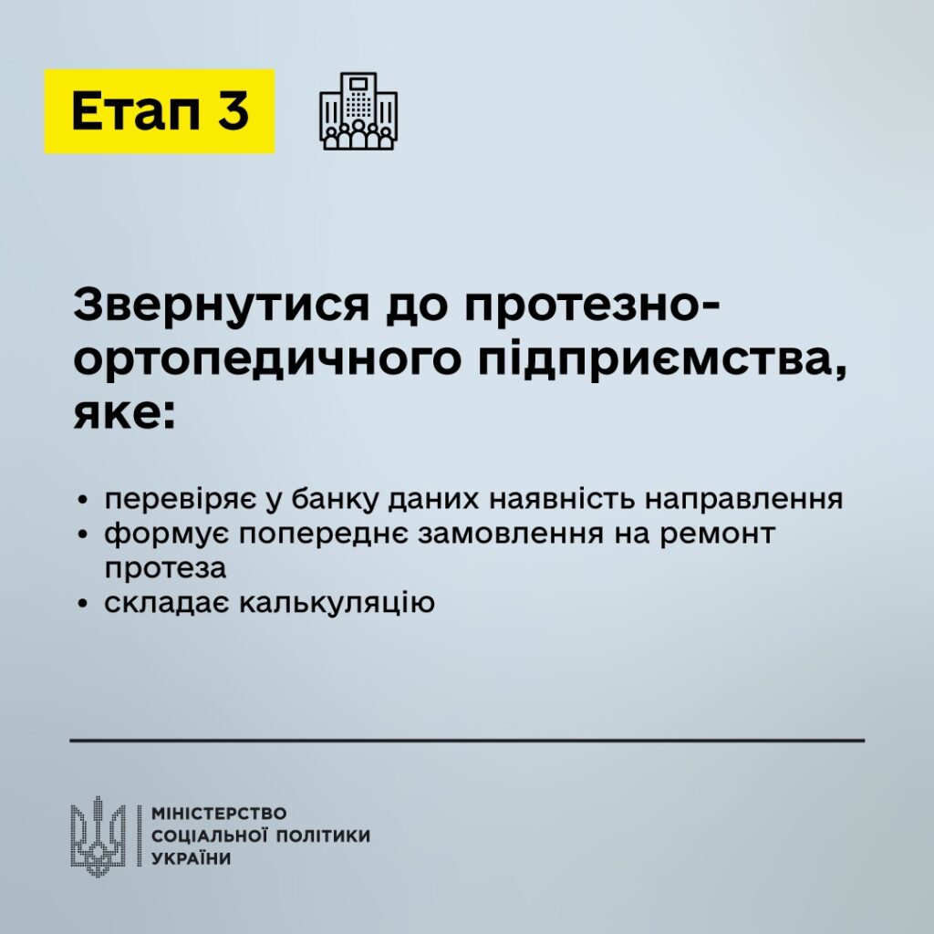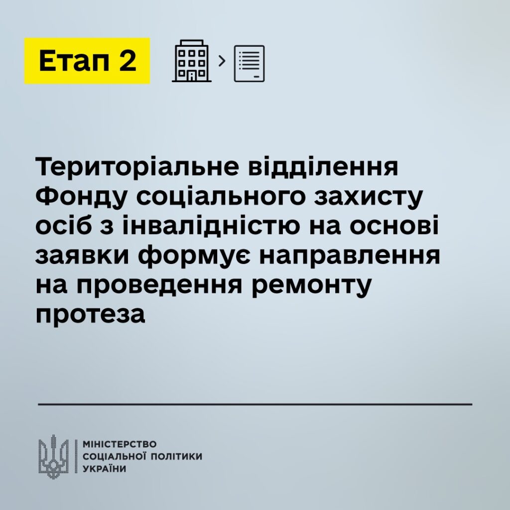 Перший етап – подати заявку на ремонт протеза до:• управління соціального захисту населення;• ЦНАПу;• територіального відділення Фонду соціального захисту осіб з інвалідністюабо через електронний кабінет особи з інвалідністю (https://ek-cbi.msp.gov.ua/)