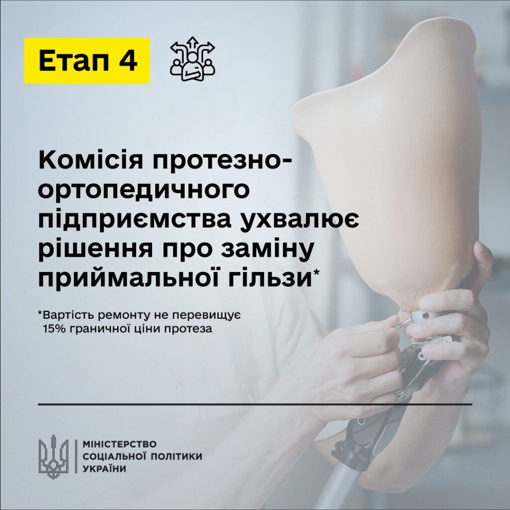 Після цього потрібно звернутися до протезно-ортопедичного підприємства. На сьогодні в різних регіонах України працює близько 100 таких підприємств. На підприємстві у базі даних перевіряють наявність направлення на ремонт протеза. За наявності направлення, формують попереднє замовлення і складають калькуляцію.Якщо вартість заміни приймальної гільзи не перевищує 15% граничної ціни протеза, рішення про її заміну приймається комісією протезно-ортопедичного підприємства. До складу цієї комісії входять лікар, фахівець з реабілітації та протезист.