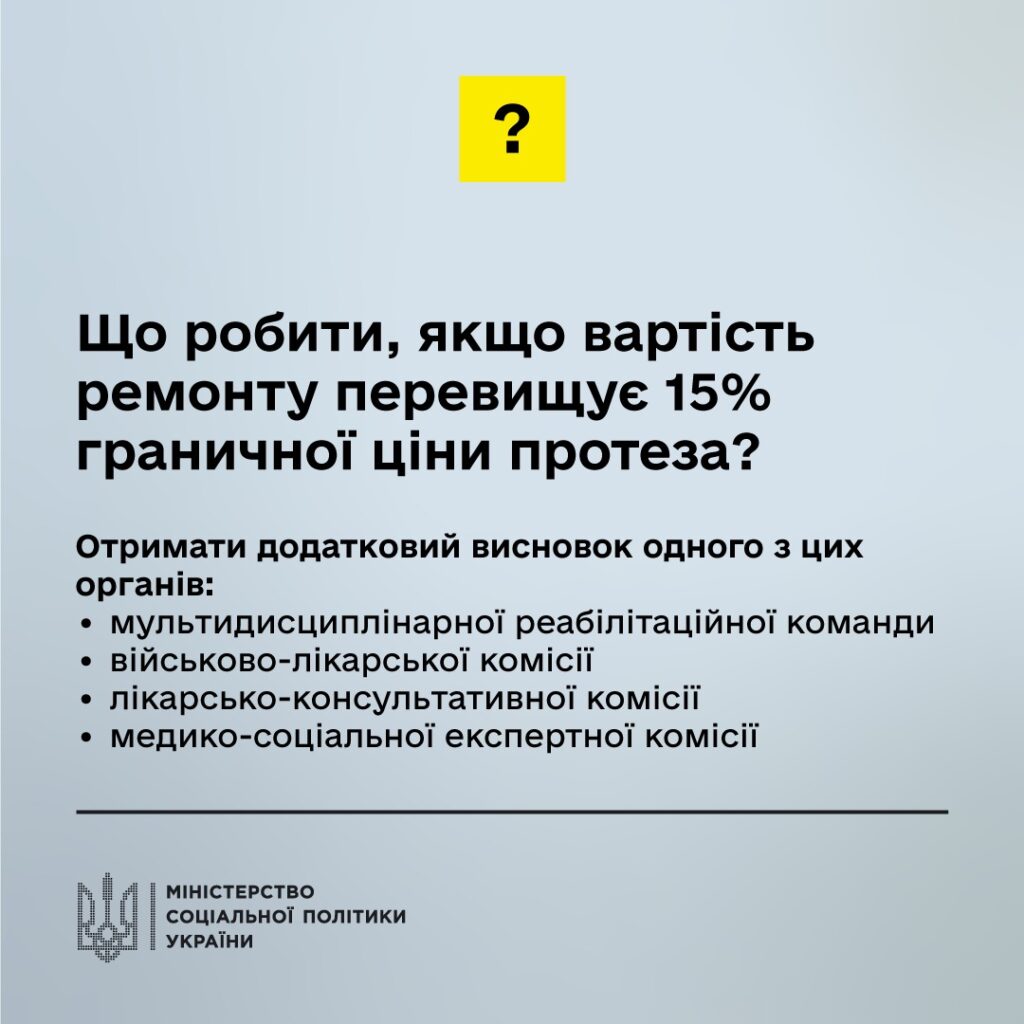 Зауважимо, якщо вартість приймальної гільзи виявиться більш ніж на 15% вищою за граничну ціну протеза, у такому випадку необхідно отримати додатковий висновок одного з цих органів:• мультидисциплінарної реабілітаційної команди;