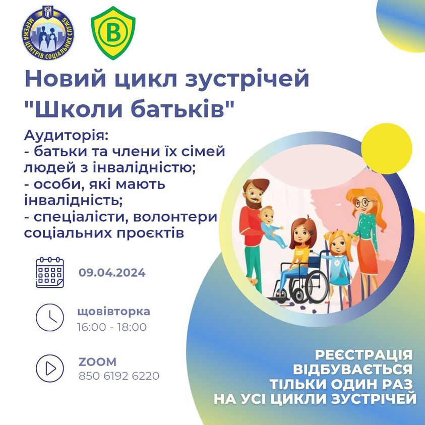 9 квітня о 16.00 розпочинається новий цикл зустрічей «Школи батьків». Запрошуються батьки та члени сімей людей з інвалідністю; особи, які мають інвалідність; спеціалісти, волонтери соціальних проєктів.