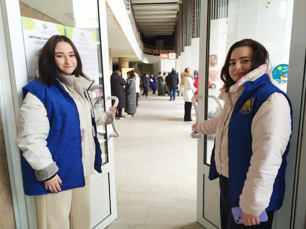 На фото студентки Київського фахового коледжу прикладних наук Марія та Вікторія розкривають двері на виставку;
