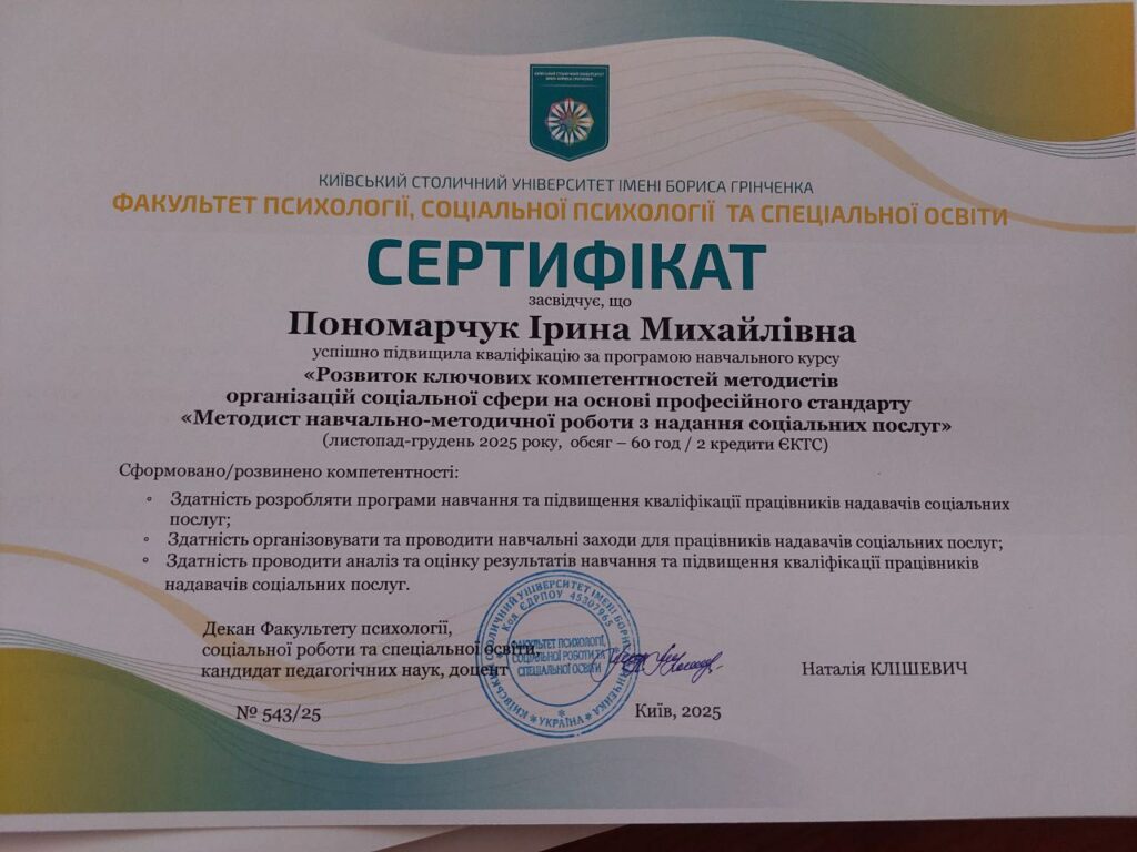 - 2024 – Проходження програми для тренерів «Тренінг для тренерів «Технології роботи з батьками»