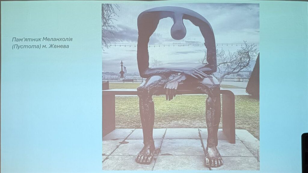 На фото фрагмент презентації, де зображена скульптура “Меланхолія”