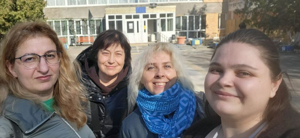 На фото 4 представниці КМЦСС на ганку Київського міського пансіонату ветеранів праці